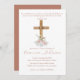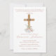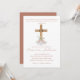 Cette élégante invitation au baptême florale personnalisée présente une image d'aquarelle religieuse au centre. Une croix de bois est agrémentée de fleurs blanches et blush, et d'une végétation délicate. Un exemple de verset biblique pour le baptême est imprimé au-dessus de la croix de bois.