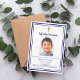 Un arrière - plan blanc, décoré d'un cadre bleu marine, et une croix dorée Personnalisez et ajoutez un nom photo et des détails. Texte bleu. Cadre photo en forme d'arc. Dos : bleu marine.