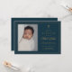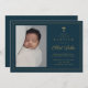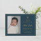 Cette Classic Elegant Gold Cross Baby Photo Baptism Invitation comprend un cadre et une croix parties scintillant or simple, le nom du script, la photo verticale et le texte propre et chic éditable. Cliquez sur le bouton Modifier pour customiser cette conception.
