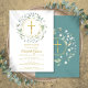Une guirlande décorative verdoyante et la croix d'or s'assoient au-dessus de votre première communion sacrée spéciale invitation à l'information sur ce design élégant.