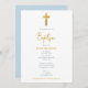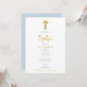 Une belle décoration mettant en vedette une Croix d'or, un script manuscrit et un arrière - plan bleu au verso de la carte. Un design religieux idéal pour le baptême de bébé garçon. La collection de ce design présente des articles de papeterie et de décoration assortis.
