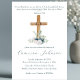 Cette élégante invitation au baptême florale personnalisée présente une image d'aquarelle religieuse au centre. Une croix de bois est agrémentée de fleurs blanches et bleues et d'une végétation délicate. Un exemple de verset biblique pour le baptême est imprimé au-dessus de la croix de bois.