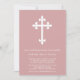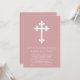 Invitation baptême personnalisable avec une croix blanche sur un arrière - plan rose poussiéreux.