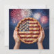 Deux mains tenant fièrement une tarte aux cerises ornée d'une belle croûte en forme de drapeau américain, sur un fond éblouissant de feux d'artifice.