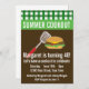 Cette invitation à la fête de cuisine comporte un cheeseburger et une spatule ainsi qu'une nappe à damiers verte et des champs de texte pour vos informations sur la fête.