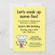 Cuisine pour enfant modèle d'invitation à la fête d'anniversaire. Invitations personnalisés pour les enfants. Personnalisez le texte du faire-part, le numéro d'âge et la couleur de l'arrière - plan. Dessin amusant du chef cuisinier dessin animé tenant fourchette et couteau.