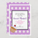 Un mignon motif composé de pois blancs sur un arrière - plan lavande violet. Personnalisez les détails de votre fête d'anniversaire dans un cadre blanc au centre. Un joli cupcakee d'anniversaire avec une cerise sur le dessus se trouve dans le coin.