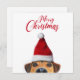 Beau joyeux dessin animal de Noël : Curieux chien portant un chapeau de Père Noël. Salutation saisonnière écrite en lettres de typographie moderne.