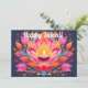 This Diwali card glistens with spiritual warmth and festive charm. A stunning lotus takes center stage, its layered petals painted in rich pinks, tangerine, and deep violet, each one radiating outward like ripples from a sacred flame. Nestled at its heart is a glowing diya, flickering gently with golden light. The backdrop is a twilight canvas of midnight blue, speckled with delicate dots and flourishes, adding a celestial touch.