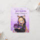 Cute birthday invitations for a girl's birthday party. A sweet anime girl in a fox ears hoodie holding a purple and black birthday cake. On the back is a cute anime dragon and your birthday party details.