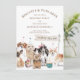 Invitation à la fête du 1er anniversaire d'un joli chien à l'aquarelle avec des chiens fantaisistes portant des chapeaux de fête. Des points festifs au dos de l'invitation sur fond marron. Thème biscuits et gâteaux pour chiots.