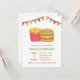 Une invitation à la fête anniversaire de enfant avec une jolie illustration d'un paquet rouge de frites et d'un hamburger aux drapeaux colorés à l'élastique. Personnalisez facilement avec les détails de votre fête dans le texte coloré modèles fournis!