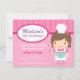 Organisez une fête d'anniversaire à la maison ou un studio d'cuisines spécial et faites participer vos enfants à la cuisson amusante et faites des gâteaux et des biscuits qu'ils peuvent déguster à la fête ou rapporter à la maison! Cette invitation présente une jolie fille avec un groupe de cheveux roses, un chef casquette et un tablier blanc. Elle tient un fouet et prépare le mélange de cuisson dans un bol en forme de coeur. Les teintes roses, les points et les rayures sont sucrées et filles pour une fille d'anniversaire ! Personnalisez facilement vos détails de fête!