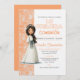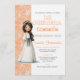 Adorable First Communion invitation with a cute girl and a soft peach background. A beautiful Catholic design perfect for your daughter’s First Holy Communion celebration.