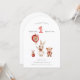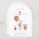 Celebrate your little one's special day with this adorable 'Hop along and celebrate' themed invitation. Featuring charming watercolor illustrations of a bunny rabbit, teddy bear, and a smaller bunny, this design is perfect for a whimsical first birthday party. The playful red and white gingham accents and a sweet apple balloon add a festive touch, making it a memorable way to invite guests to your baby's milestone celebration. This invitation is sure to delight both children and adults alike.