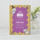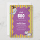 Un petit boo est presque dû! thème baby shower, baby shower halloween, design caractéristique mignon fantôme en sorcier casquette, mignon chat poème avec cravate arc et toile d'araignée dans le cadre ondulé dans l'halloween coloré orange, violet, vert rayé arrière - plan. vous pouvez customiser votre propre couleur et texte. moderne fun automne, automne octobre baby shower, ce design neutre genre parfait pour maman-être, baby shower garçon et fille.