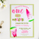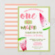 Un dans une invitation de fête de premier anniversaire de melon pour votre petite fille, avec des tranches de pastèque aquarelle. Les couleurs sont principalement roses et vertes.