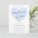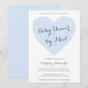 Baby shower mignon par invitation par courrier pour quand vous ne pouvez pas vous réunir en personne. Cette invitation présente un design simple avec un coeur bleu pastel et une typographie fantaisiste pour le titre de l'événement et le nom de la Maman-to-Be. L'arrière est assortie d'une teinte bleue. Célébrez la naissance prochaine de votre bébé de l'autre côté des miles avec un baby shower "longue distance".