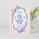 A cute girly 5th birthday party invitation for a little girl turning five, this whimsical design features a hand drawn doodle frame with pink bows and blue outline. A birthday cake with 5 candles near the center of the invitation adds a festive accent. Personalize the text with your party details. This invitation may be ordered in both printed and instant download digital formats.