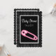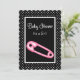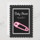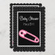 Un mignon rose et noir c'est une invitation baby shower fille avec des pois noirs et blancs élégants et une épingle de couche rose ceinturon. Personnalisez en ajoutant le nom de la maman à être et les détails de la fête de la petite fille. ©PlansPartie