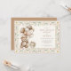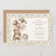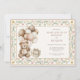 Célébrez le 1er anniversaire de votre bébé avec une adorable invitation d'ours en peluche à l'aquarelle, avec des ballons, dans des tons crème et marron, ainsi qu'une bordure dorée et feuillue décorative. Style Whimsical illustré. Disponible en version imprimée, en téléchargement numérique ou les deux !