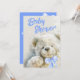 Invite friends and family to celebrate the Mother-To-Be with this Baby Shower Invitation designed with a cute baby bear with a blue ribbon on the front and the text: Baby Shower in blue. The reverse side is decorated with a watercolor blue ribbon with white text on a matching blue background. The reverse text includes: Please Join Us For A, Baby Shower, Honoring, The Name, Date, Time, Location Name (venue or residence), Address and RSVP Details. To personalize this invitation, simply insert your event details into our easy template, replacing the sample text.
