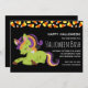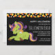 Une invitation à la fête d'Halloween avec l'image d'une licorne zombie. Couleurs violettes et vertes. Éffrayant mignon.