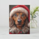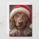 L'image montre un dachshund adorable habillé de manière festive, portant un chapeau rouge de Père Noël avec une garniture blanche duveteuse. Les grands yeux expressifs et le nez noir brillant du chien sont les points focaux de la prise de vue rapprochée, créant une atmosphère chaleureuse et charmante de vacances. Le dachshund porte également une tenue rouge confortable avec un col en fausse fourrure, ajoutant à l'atmosphère festive et chaleureuse de la scène.