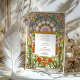 Cette superbe faire-part de mariage Art Nouveau présente une arche fleurie colorée remplie de fleurs d'oranger vives, de délicates marguerites blanches, de cosmos rose doux et de beignets bleu clair. Des détails botaniques ornés et des accents dorés encadrent la zone de texte, créant un mélange harmonieux d'élégance d'inspiration nature et de charme vintage. La disposition symétrique et le tracé complexe en font un design parfait pour les couples à la recherche d'une papeterie mariage romantique et intemporelle avec une touche de sophistication artistique.