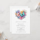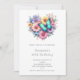 A birthday invitation with a beautiful illustration. A heart-shaped bouquet of flowers in pastel blue, green, purple and yellow. With a lovely blue butterfly hovering in front.