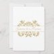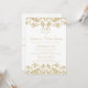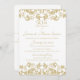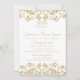 Invitation romantique en damassé doré et blanc décorée en haut et en bas d'un majestueux emblème nominatif doré au verso. Texte de style classique et formel et illustration dessinée à la main pour un ensemble d'invitations d'anniversaire de 50 ans unique et magnifique.