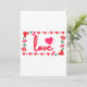 Cette invitation met en valeur le mot « amour » dans une police d'impression unique avec des lettres rouges et un contour rose à l'intérieur d'un design de style rectangulaire avec des cœurs, des roses et un cœur de style fraise sur deux coins dans le thème de la Saint-Valentin. Imprimé sur un papier classique de 17,5 pt d'épaisseur avec une finition mate non couchée et une texture de coquille d'œuf, fabriqué et imprimé aux États-Unis avec « Amour » imprimé au dos.
