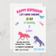 Invitation d'anniversaire "Let's Horse Around" avec nom personnalisé et âge célébrant le plaisir, les jeux, gâteaux et glaces.