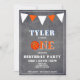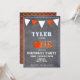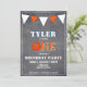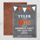 Invitation d'anniversaire 1 an Basketball Tableau Noir Mignonne. Carte d'anniversaire de basketball pour le premier anniversaire. Le design comporte un grand basketball et des drapeaux en orange et blanc sur fond de tableau noir. Personnalisez cette invitation d'anniversaire avec le nom de l'enfant et une photo et personnalisez toutes les données sur l'invitation. Idéal comme invitation pour la fête d'anniversaire d'un garçon de 1 an.