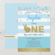 Invitation à une fête sur le thème de lapin mignon bleu et or pour le premier anniversaire de bébé garçon.