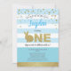 Invitation de fête thème lapin mignon bleu et or pour le premier anniversaire de bébé garçon.