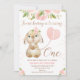 Jolie invitation d'anniversaire pour le premier anniversaire de votre petite fille avec un lapin, avec un titre en calligraphie rose doré. Le design comporte également un arrangement floral rose et un ballon en forme de cœur rose. C'est un design adorable pour le tout premier anniversaire de votre petite fille.