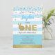 Invitation de fête thème lapin mignon bleu et or pour le premier anniversaire du bébé garçon.