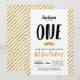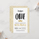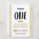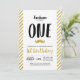 Célébrez un jour spécial avec cette invitation moderne de premier anniversaire dorée et noire ! Ce design présente un graphique de moustache mignon et une typographie à paillettes dorées.