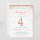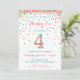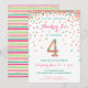 Célébrez l'anniversaire de votre enfant de 4 ans avec des confettis dorés, roses, mints et sarcelles colorés sur ces invitations d'anniversaire 4 ans ! Avec les détails de la fête de votre fille et un "4" en confettis. Le titre indique "HIP HIP HOORAY !" Jolies rayures colorées assorties au verso.