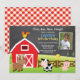 Invitation d'anniversaire à la ferme avec photo personnalisée. Animaux de la ferme de campagne. Grange Vache Cochon Cheval Poulet. Anniversaire garçon ou fille. 1er Premier anniversaire. 1er 2e 3e 4e 5e 6e 7e 8e 9e 10e 11e 12e 13e 14e 15e, Tout âge. Fond à carreaux rouge et blanc avec tableau noir. Numérique imprimable. Pour une personnalisation plus poussée, veuillez cliquer sur le bouton "Personnaliser" et utiliser notre outil de conception pour modifier ce modèle.