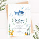 Invitation à une fête d'anniversaire avec un thème sous-marin pour l'anniversaire d'un enfant. Cette invitation comporte un bébé requin aquarelle mignon peint à la main et des éléments nautiques comme une ancre. Parfait pour une fête d'anniversaire d'enfants.