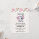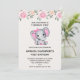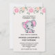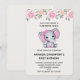 Une invitation d'anniversaire Une invitation de fête d'anniversaire avec une illustration aquarelle d'un éléphant rose mignon. Elle a des oreilles à pois roses et blancs adorables et un joli nœud ruban rose sur le dessus de sa tête. Le dessus est orné d'un beau bouquet de roses.