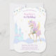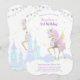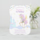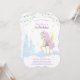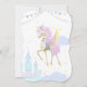 Invitation d'anniversaire avec une adorable licorne aux ailes, qui est entourée de jolies photos d'un château magique, des nuages et des bruits festifs.