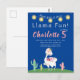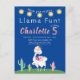 Faites la fête avec cette invitation d'anniversaire avec un lama complètement amusant. Ce design présente une guirlande de lumières en forme d'étoiles sur fond bleu foncé avec un cactus et un lama décoré d'une couronne et de fleurs.