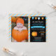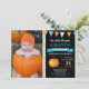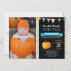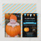 Invitation d'anniversaire Citrouille avec photo personnalisée. Invitation d'anniversaire du Petit Citrouille d'automne. 1er anniversaire. Bande orange et bleue, arrière - plan en damier.