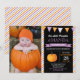 Invitation d'anniversaire Citrouille Fille avec photo personnalisée. Invitation d'anniversaire Petite Citrouille d'Automne. 1er Premier Anniversaire. Rayures orange et violettes, fond tableau noir. Pour une personnalisation plus poussée, veuillez cliquer sur le bouton "Personnaliser" et utiliser notre outil de conception pour modifier ce modèle.