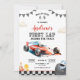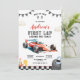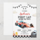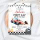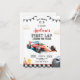 Cette invitation d'anniversaire pour voiture de course présente un thème de sport automobile amusant avec des drapeaux à damier, une illustration colorée de voiture de course et une typographie audacieuse.