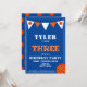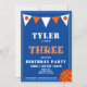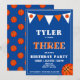 Invitation d'anniversaire de basketball bleu mignon pour le 3e anniversaire. Carte d'anniversaire de basketball mignonne pour le 3e anniversaire. Le design comporte un grand basketball et des drapeaux à bunting de couleurs orange et blanc sur un fond bleu. Le verso présente un motif de basketball. Personnalisez cette invitation d'anniversaire avec le nom d'un enfant et personnalisez toutes les données sur l'invitation. Idéal comme invitation pour une fête d'anniversaire de 3 ans pour un garçon.