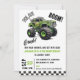 Invitation d'anniversaire sur le thème des camions monstres pour garçon avec un camion vert, des drapeaux de course et un motif à damier. Peut être utilisé pour n'importe quel âge.